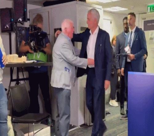 穆里尼奥重返斯坦福桥,87岁的Brian Pullman特意赶到媒体会议室,看望穆里尼奥。看到Brian Pullman,穆里尼奥拥抱老者,笑着说:“我最喜欢吃的饼干呢?”