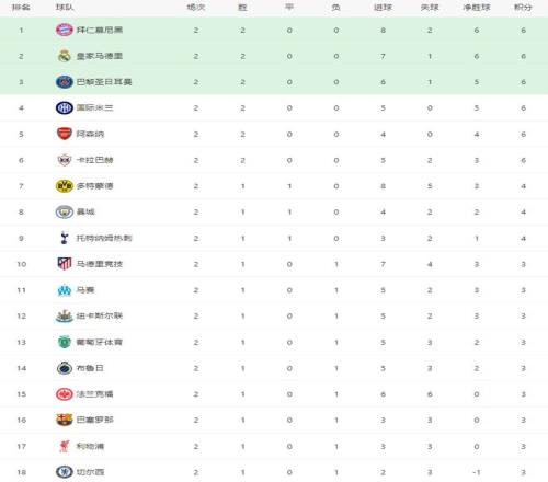 随着巴黎21绝杀巴萨,曼城22遭绝平,欧冠最新积分榜:拜仁领跑