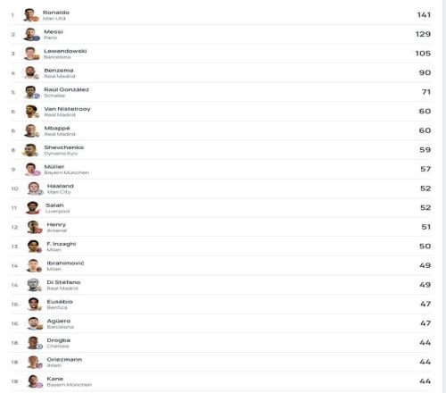 欧冠历史射手榜TOP20(含资格赛)