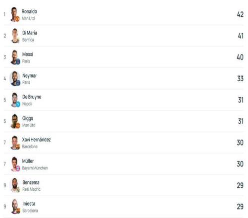 欧冠历史助攻榜:德布劳内进前5,C罗居首梅西第三