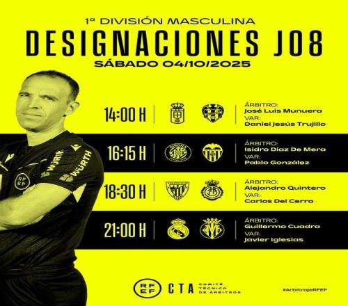 雷速体育10月3日宣 西甲官方公布了当地时间10月4日四场西甲联赛的裁判安排,吉列尔莫·夸德拉主哨皇马对阵比利亚雷亚尔的比赛。