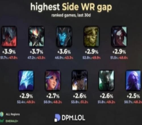 体育资讯10月4日称 外网数据统计媒体DPM.LOL分享了红蓝方胜率差距最大英雄榜单,具体如下: