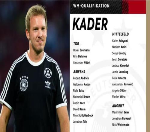 “在吕迪格受伤之后,施洛特贝克的回归至关重要。在防守端,我们还有天才小将布朗。我期待着在辛斯海姆的比赛(主场对卢森堡)座无虚席,那里对我来说意义非凡(曾任霍芬海姆主帅),也期待着在贝尔法斯特(客战北爱尔兰)与众多德国球迷一起打出一场精彩的比赛。”