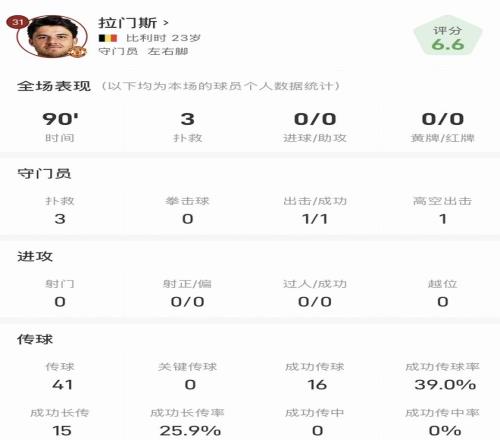 拉门斯首秀数据:3扑救、15次成功长传、出击成功1次
