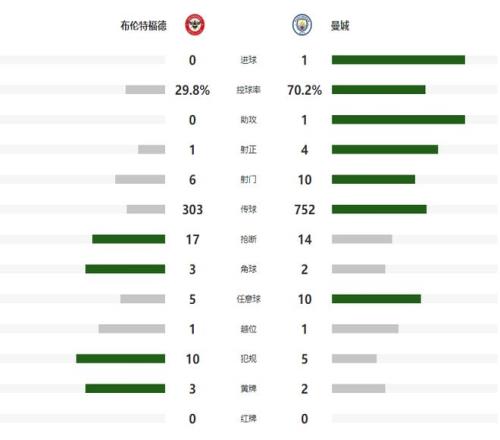休整两天之后,曼城在英超第七轮远征客场,挑战小蜜蜂布伦特福德,本场比赛哈兰德不到10分钟就帮助蓝月军团取得了比分上的领先,接下来的时间,两支球队互有攻守,但都没有取得进球,最终曼城客场1-0带走胜利!