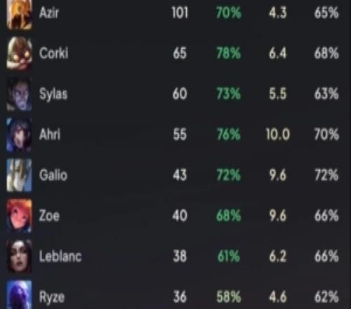 狐狸55场76%胜率;加里奥43场72%胜率;佐伊40场68%胜率;