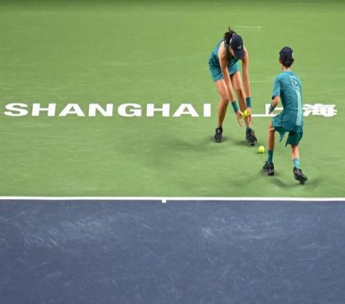 2025年10月4日,上海,久事体育场馆旗忠网球中心,两位球童飞奔着去捡球。澎湃新闻记者 朱伟辉 图