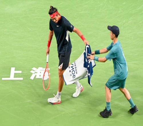 2025年10月1日,上海,久事体育场馆旗忠网球中心,球童给张之臻递毛巾。澎湃新闻记者 朱伟辉 图