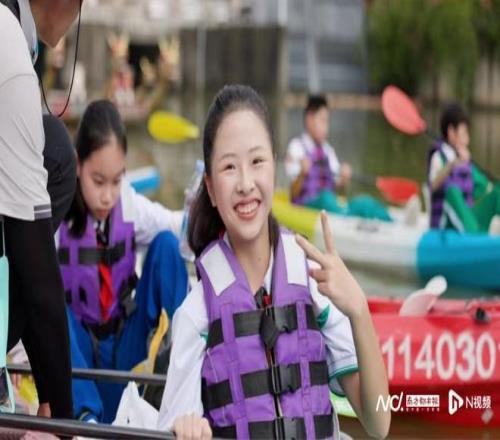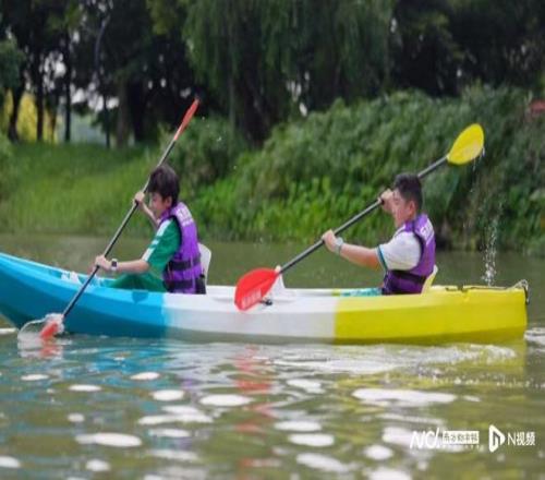 “出发!向着城市中轴线前进!”随着教练的一声令下,少年们驾着皮划艇驶离岸边。清澈的湖水中,船桨划出一道道优美的弧线,两岸的绿意随风摇曳,偶尔有白鹭从船边掠过,这样沉浸式的运动体验让大家直呼过瘾。