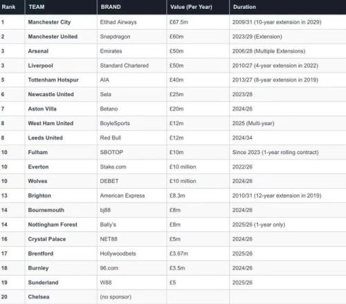 2025-26赛季英超胸前广告赞助情况一览