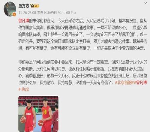 对了,北京队存在较大的变数,因为他们的核心前锋曾凡博尚未决定回归新赛季的CBA,可能会前往海外联赛效力,说是等到本期的世预赛打完之后才会有明确结果。
