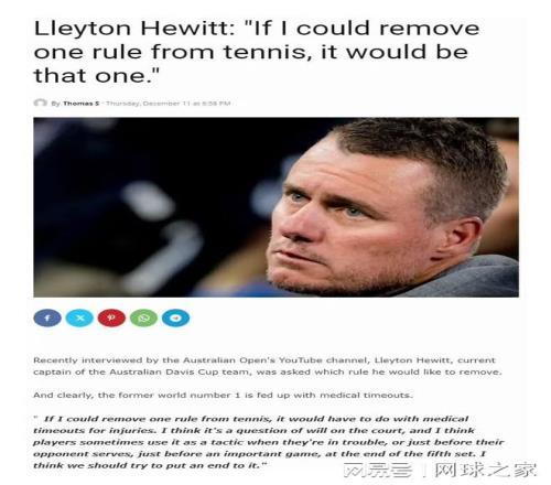 澳大利亚网球名宿休伊特近日在澳网官方采访中直言不讳,他公开呼吁,应该废除网球比赛中的伤病暂停规则。