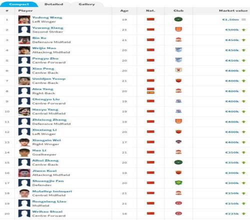 16、蒯纪闻(上海海港)19岁 30万欧元