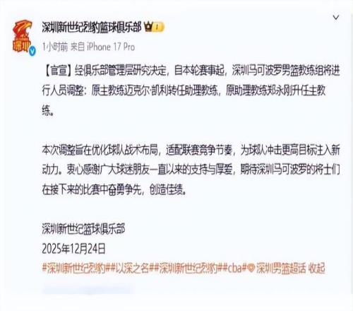 消息内容是:“经俱乐部管理层研究决定,自本轮赛事起,深圳马可波罗男篮教练组将进行人员调整:原主教练迈克尔-凯利转任助理教练,原助理教练郑永刚升任主教练。”