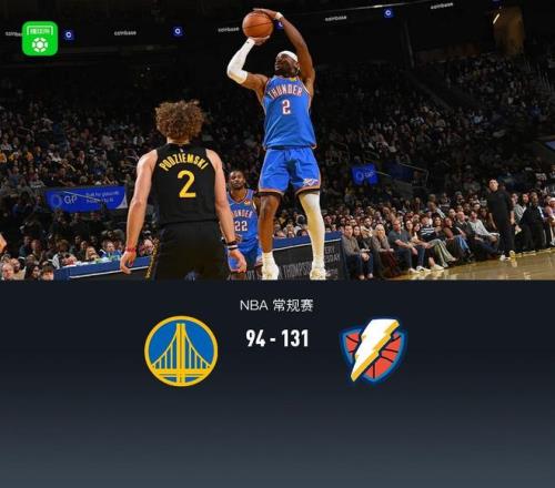 北京时间1月3日NBA 常规赛,金州勇士对阵俄克拉荷马雷霆。本场勇士库里、巴特勒、格林、梅尔顿等主力均缺阵。首节雷霆建立11分领先,次节勇士理查德站出来一度追至2分,但随后雷霆一波21-1将分差拉大至20分以上,半场雷霆64-45勇士,第三节结束雷霆领先29分,末节提前收兵进入练兵时间,最大分差41分,最终雷霆131-94勇士。